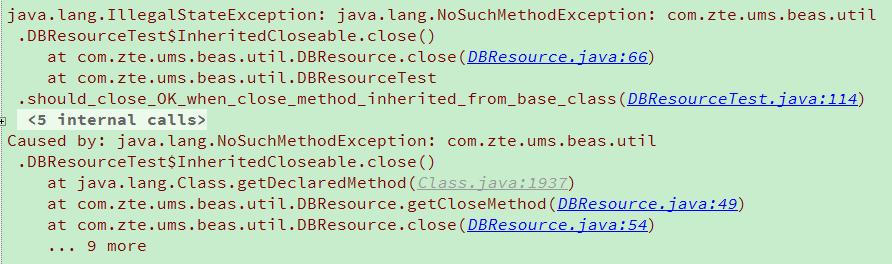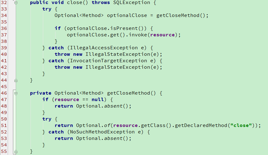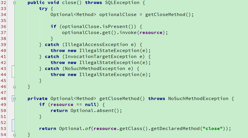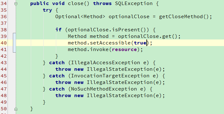 仔细考虑异常处理后,认为传入的resource对象不应该出现没有close()的情况,如果出现了,一定是编码的bug,因此果断将代码改成以下处理方式:对于无法找到close()时抛出的NoSuchMethodException转义成IllegalStateException继续抛出,如下: