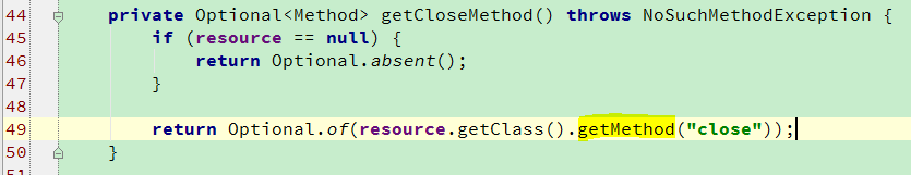 怎么会获取不到JDBC4ResultSet的close()呢?所有传入的resource都应该有close()才对,没有close()的对象是不允许被传入的。