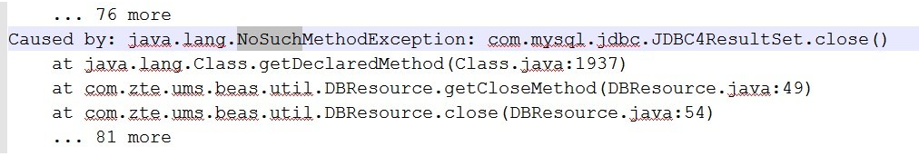 异常显示,在DBResources.getCloseMethod()获取传入的com.mysql.jdbc.JDBC4ResultSet的close()时,获取不到close()。